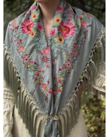 Mantón seda color verde jabonoso bordado en tonos: amarillo, rosa, fucsia, granate, azul , rojo y verde.