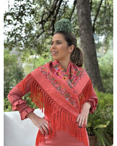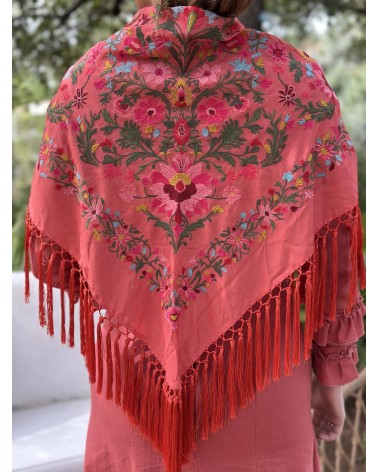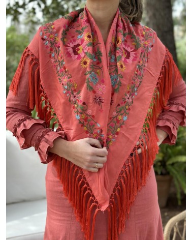 Mantón seda color coral bordado en tonos: amarillo, rosa, fucsia, granate, azul , rojo y verde.
