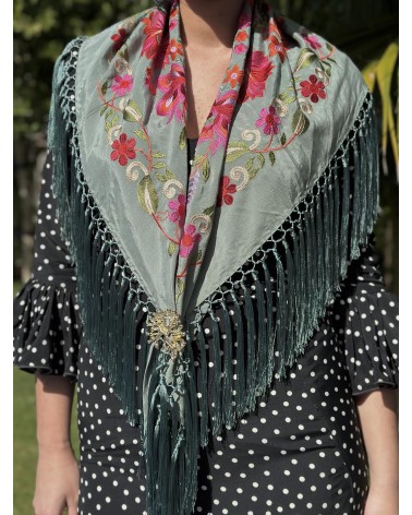 Mantón seda color verde jabonoso bordado en tonos: amarillo, rosa, fucsia, granate, azul , rojo y verde.