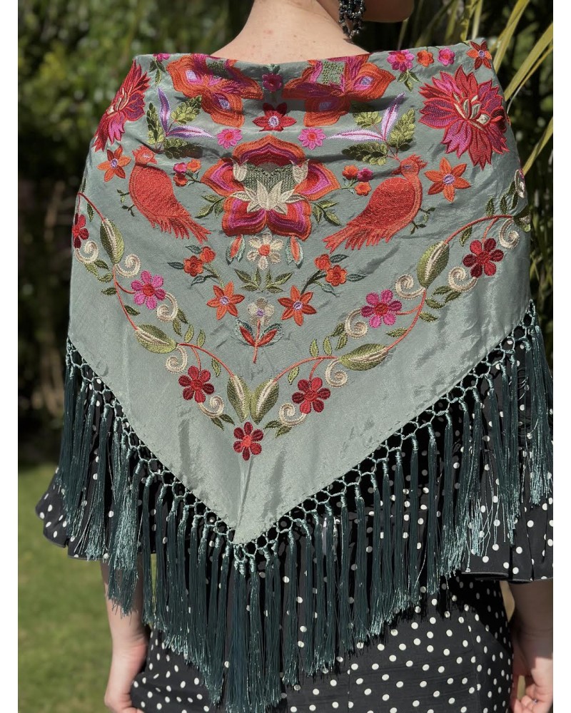 Mantón 100% seda estampado combinando flores y pájaros bordados en hilo de seda.