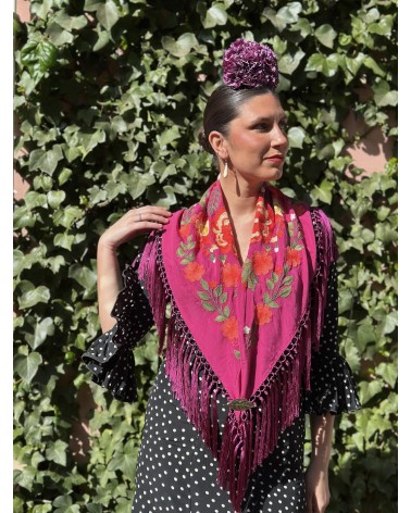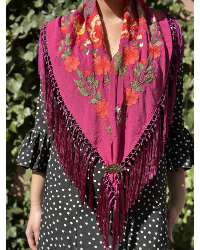 Mantón seda color buganvilla bordado en tonos: coral, salmón, verde seco, verde y beige.