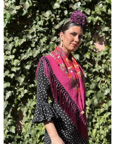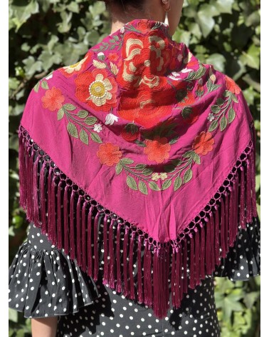 Mantón con fleco de borlón fabricado y bordado en seda. Teñido y flecado a mano.