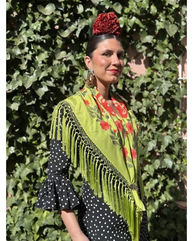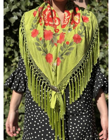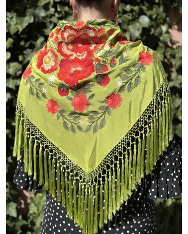 Mantón seda color verde lima bordado en tonos: coral, salmón, verde seco, verde y beige.