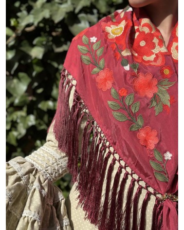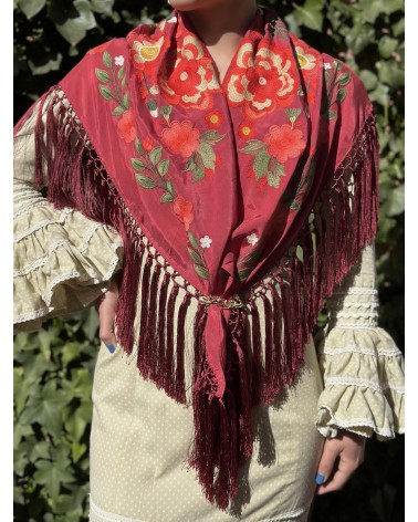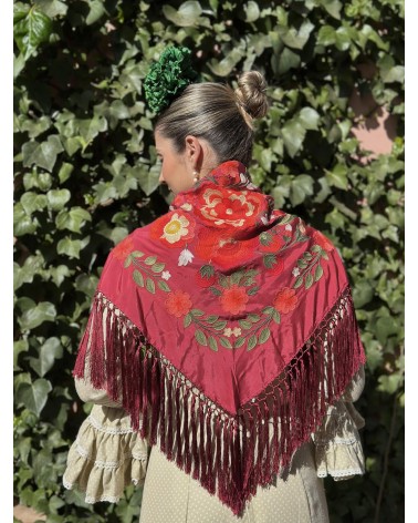 Mantón seda color granate bordado en tonos: coral, salmón, verde seco, verde y beige.