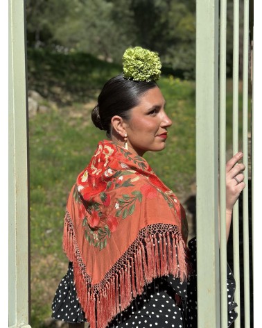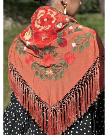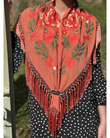 Mantón seda color coral bordado en tonos: coral, salmón, verde seco, verde y beige.
