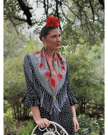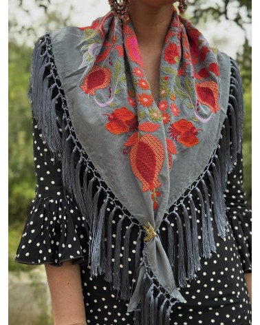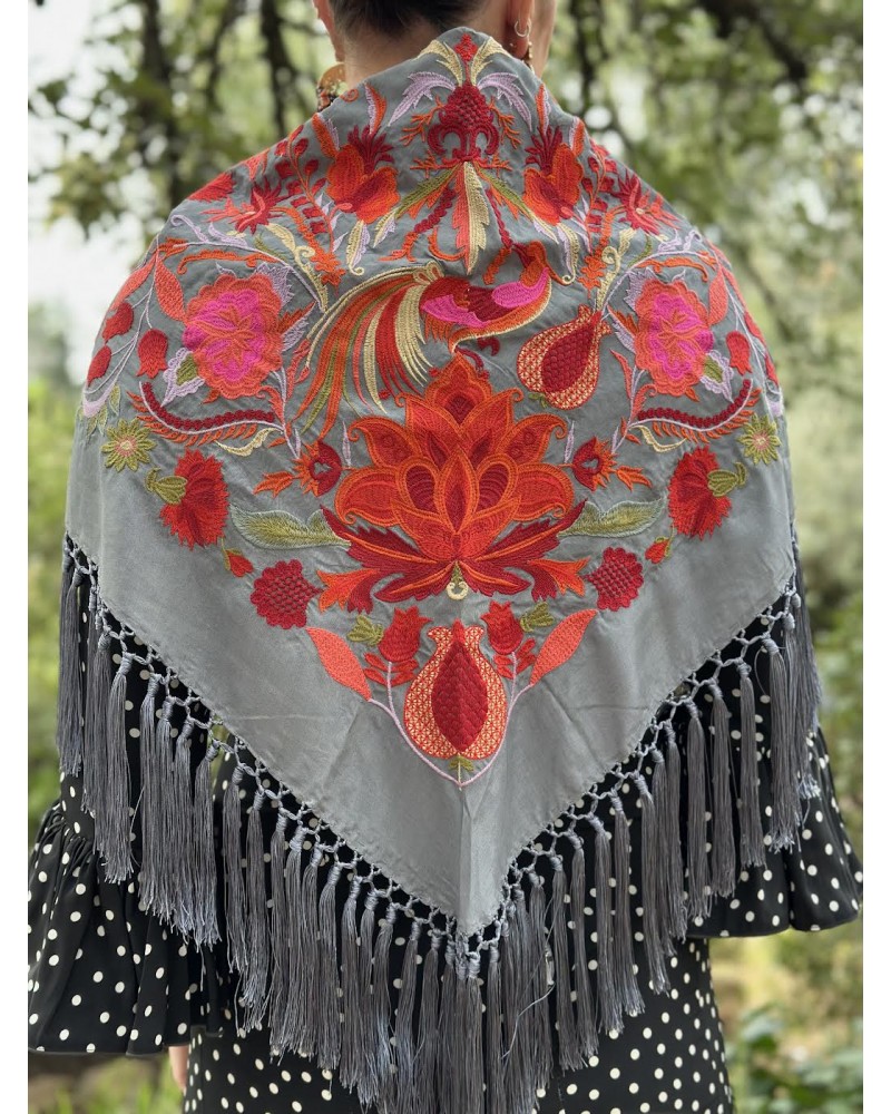 Mantón gris negra bordado en tonos: rojo, verde, fucsia, naranja, verde agua.