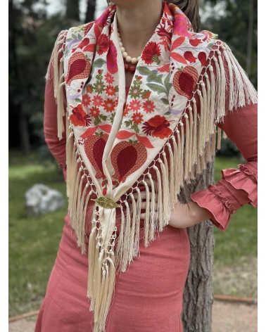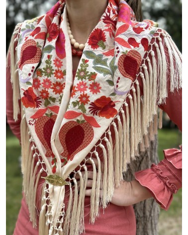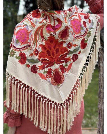 Mantón seda color hueso bordado en tonos: rojo, verde, fucsia, naranja, verde agua.