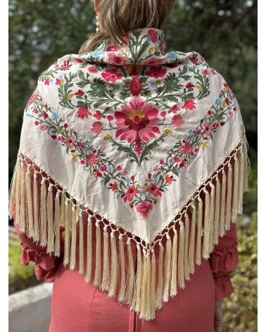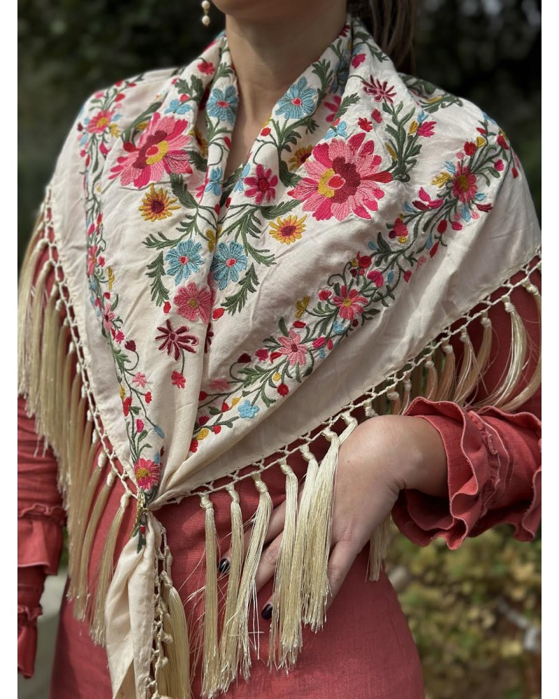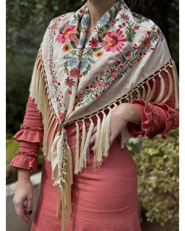 Mantón seda color hueso bordado en tonos: amarillo, rosa, fucsia, granate, azul , rojo y verde.