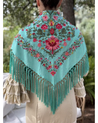 Mantón seda color turquesa clarito bordado en tonos: amarillo, rosa, fucsia, granate, azul , rojo y verde.