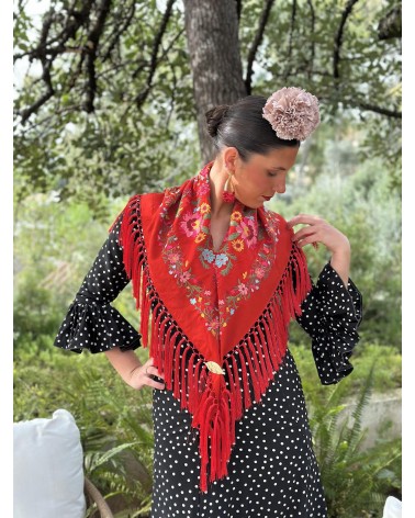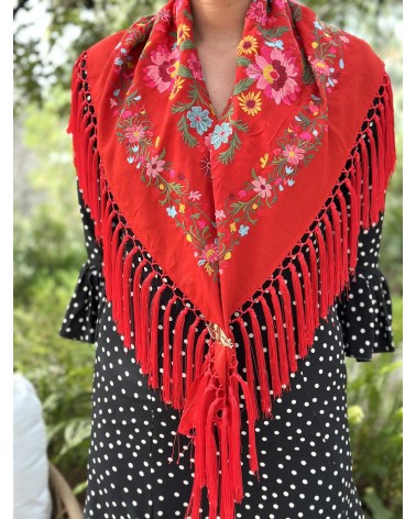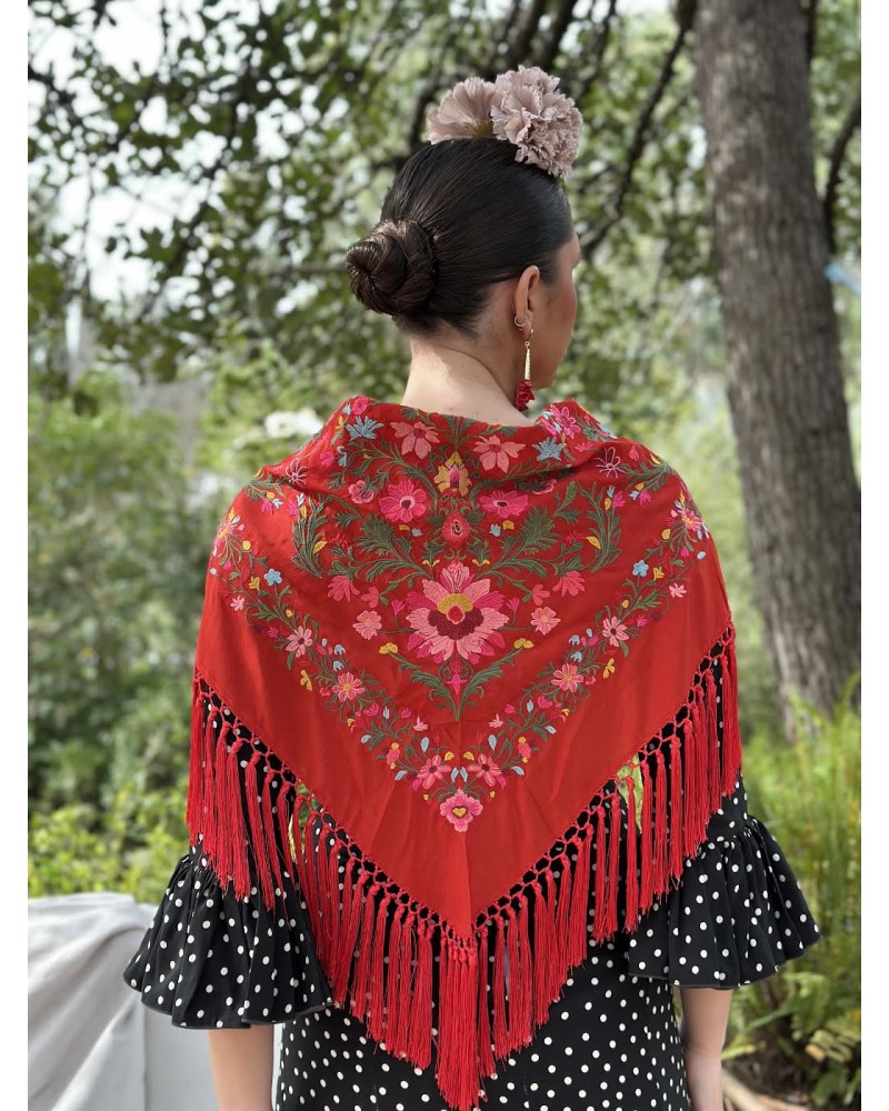 Mantón seda color rojo bordado en tonos: amarillo, rosa, fucsia, granate, azul , rojo y verde.