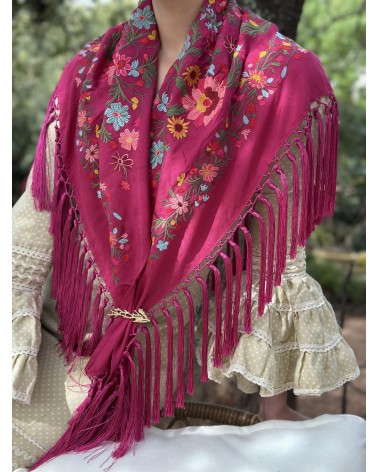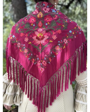 Mantón seda color burganvilla bordado en tonos: amarillo, rosa, fucsia, granate, azul , rojo y verde.