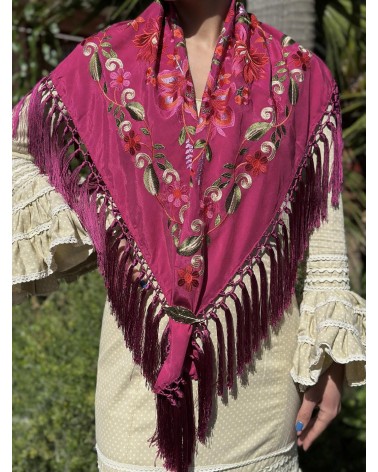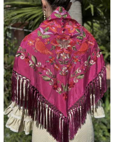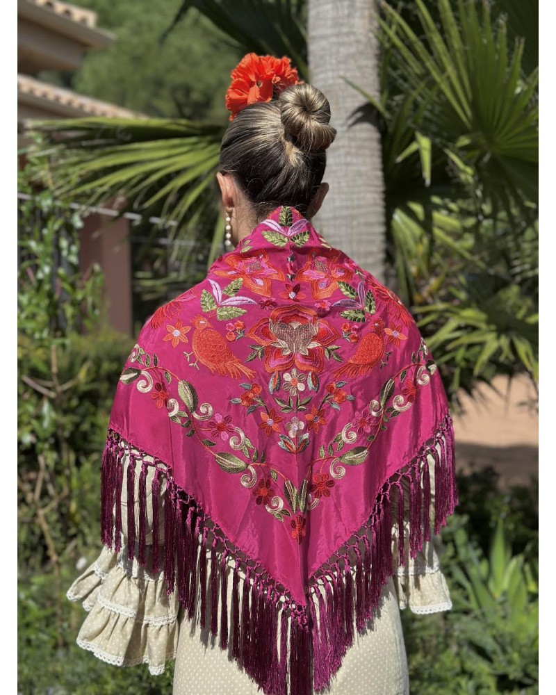 Mantón seda color buganvilla bordado en tonos: amarillo, rosa, fucsia, granate, azul , rojo y verde.