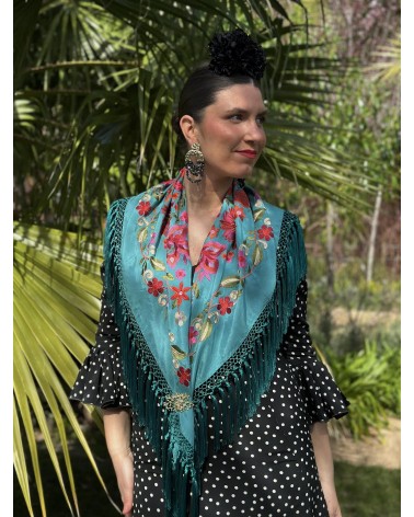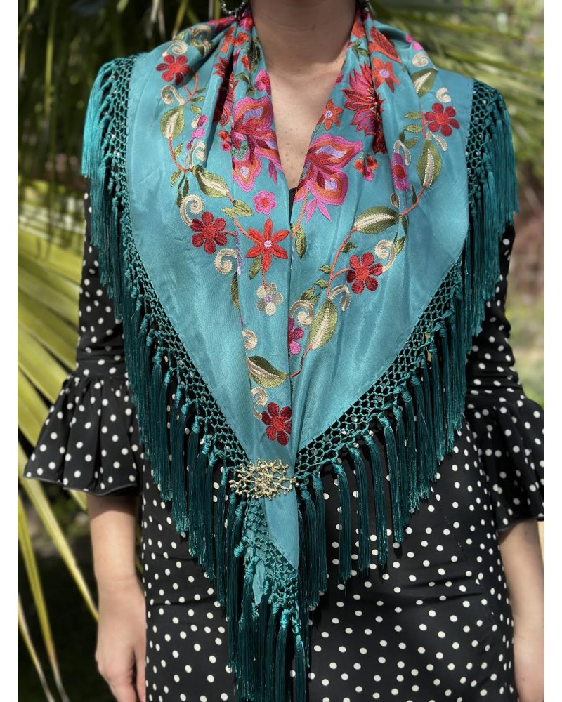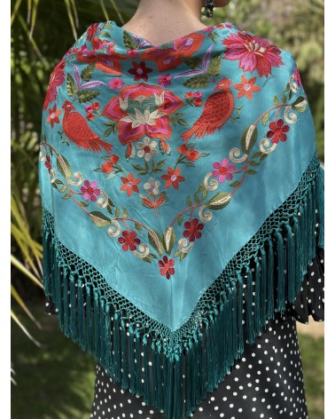 Mantón seda color turquesa oscuro bordado en tonos: amarillo, rosa, fucsia, granate, azul , rojo y verde.