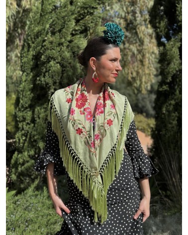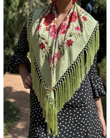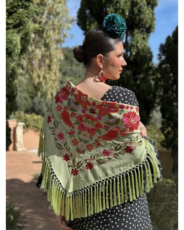 Mantón seda color lima bordado en tonos: amarillo, rosa, fucsia, granate, azul , rojo y verde.