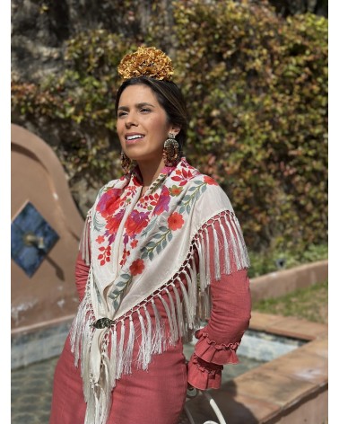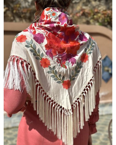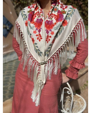 Mantón seda color hueso bordado en tonos: naranja, verde agua, buganvilla, verde y rojo.