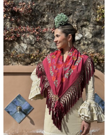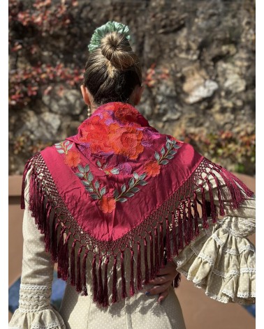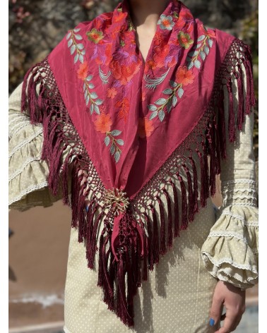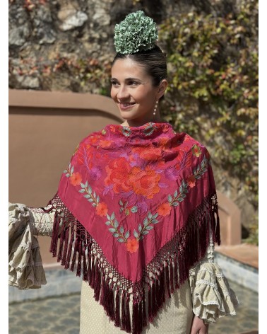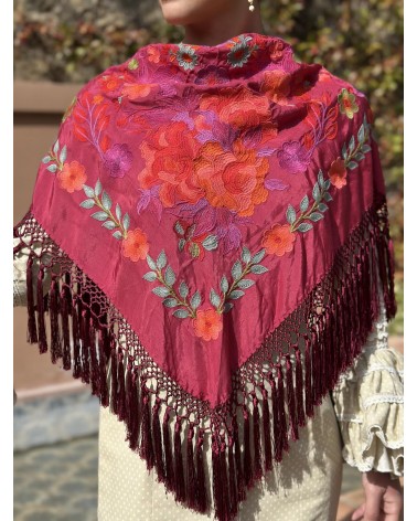 Mantón seda color granate bordado en tonos: naranja, verde agua, buganvilla, verde y rojo.