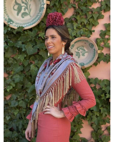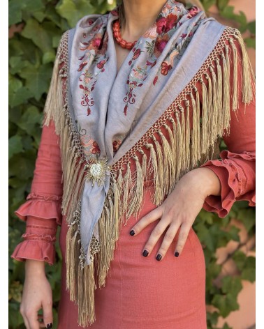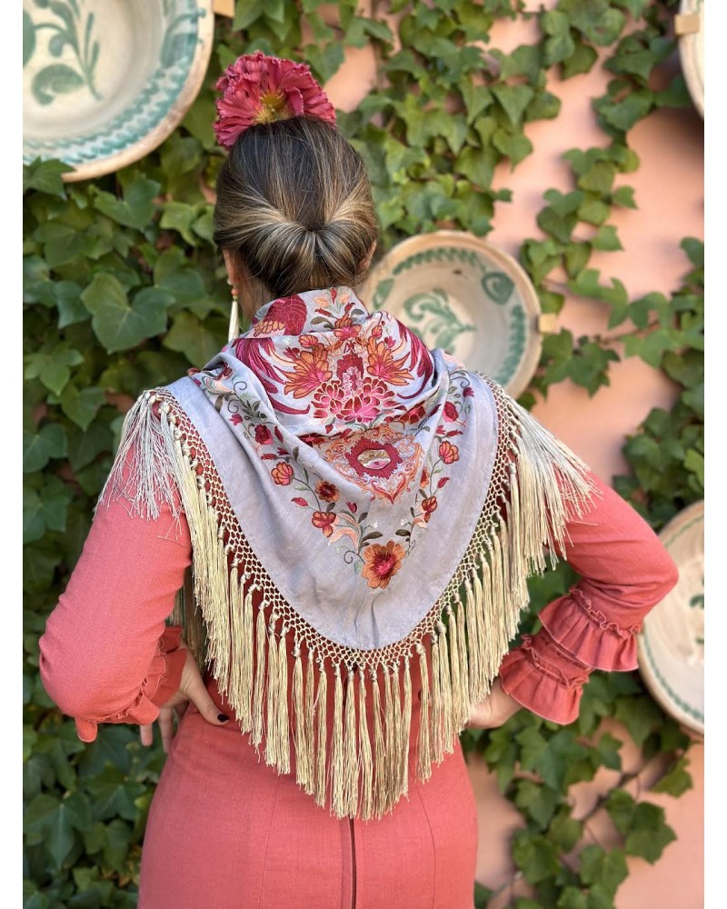 Mantón seda color gris bordado en tonos: buganvilla, gris, verde seco, verde, salmón, granate y fucsia. Flecos de borlón color champán.