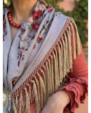 Mantón con fleco de borlón fabricado y bordado en seda. Teñido y flecado a mano.