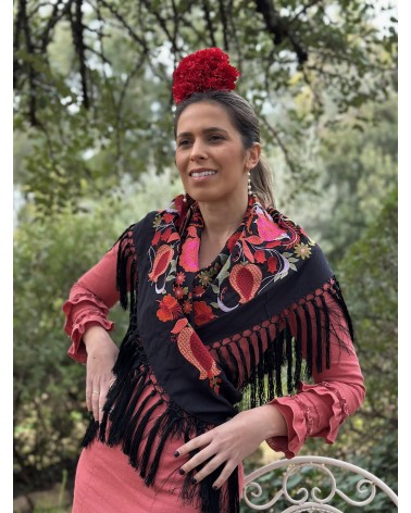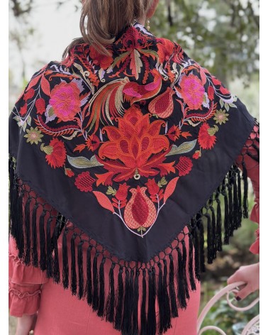 Mantón seda negra bordado en tonos: rojo, verde, fucsia, naranja, verde agua.